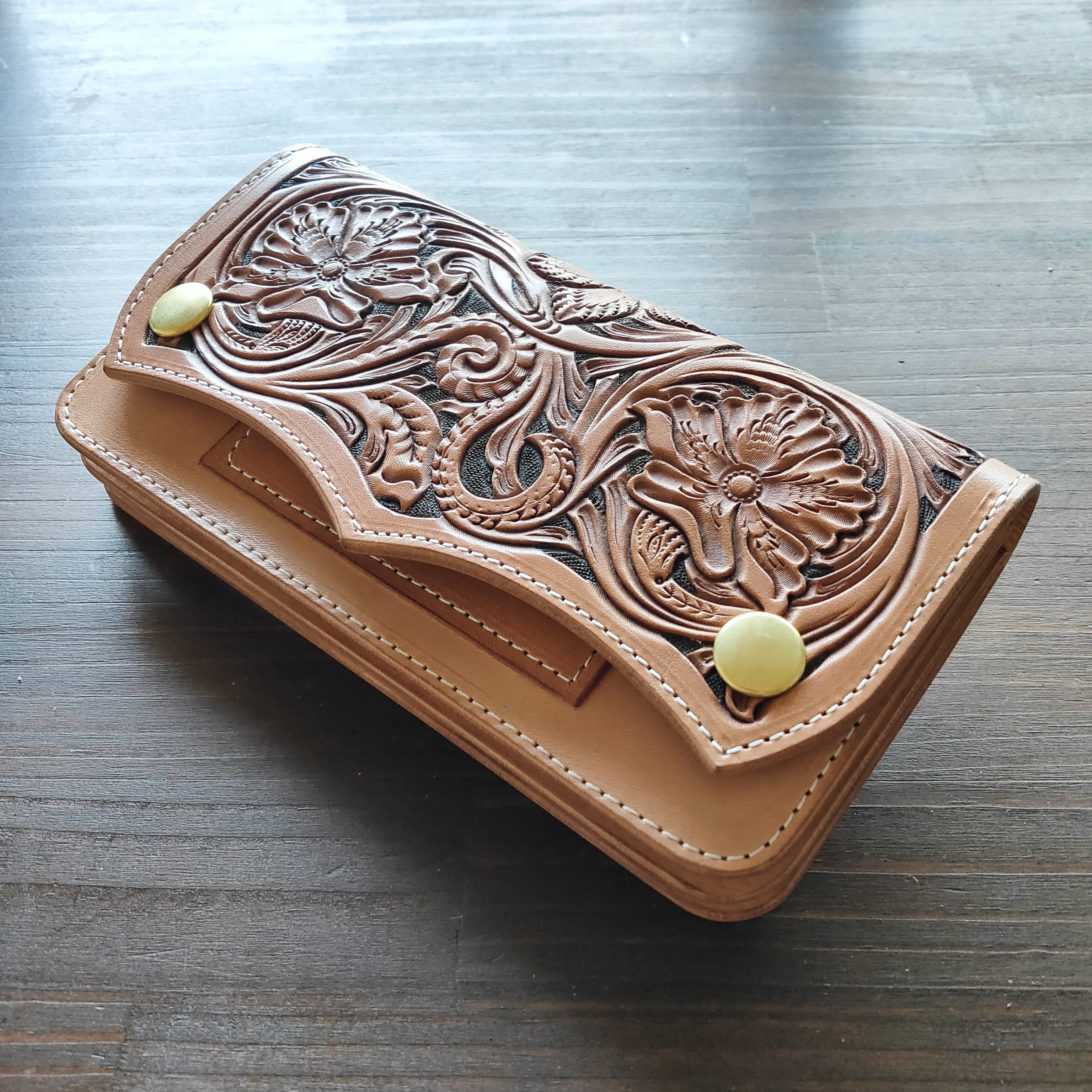 本製品は、財布の表面全体に繊細なシェリダンスタイル・レザーカービングを施したトラッカーウォレットです。職人が一つひとつ丁寧に彫り上げることで、革の表情が際立ち、立体感のある美しいデザインが完成します。カービング模様は、使い込むほどに深みを増し、唯一無二の風合いを楽しめるのが魅力です。