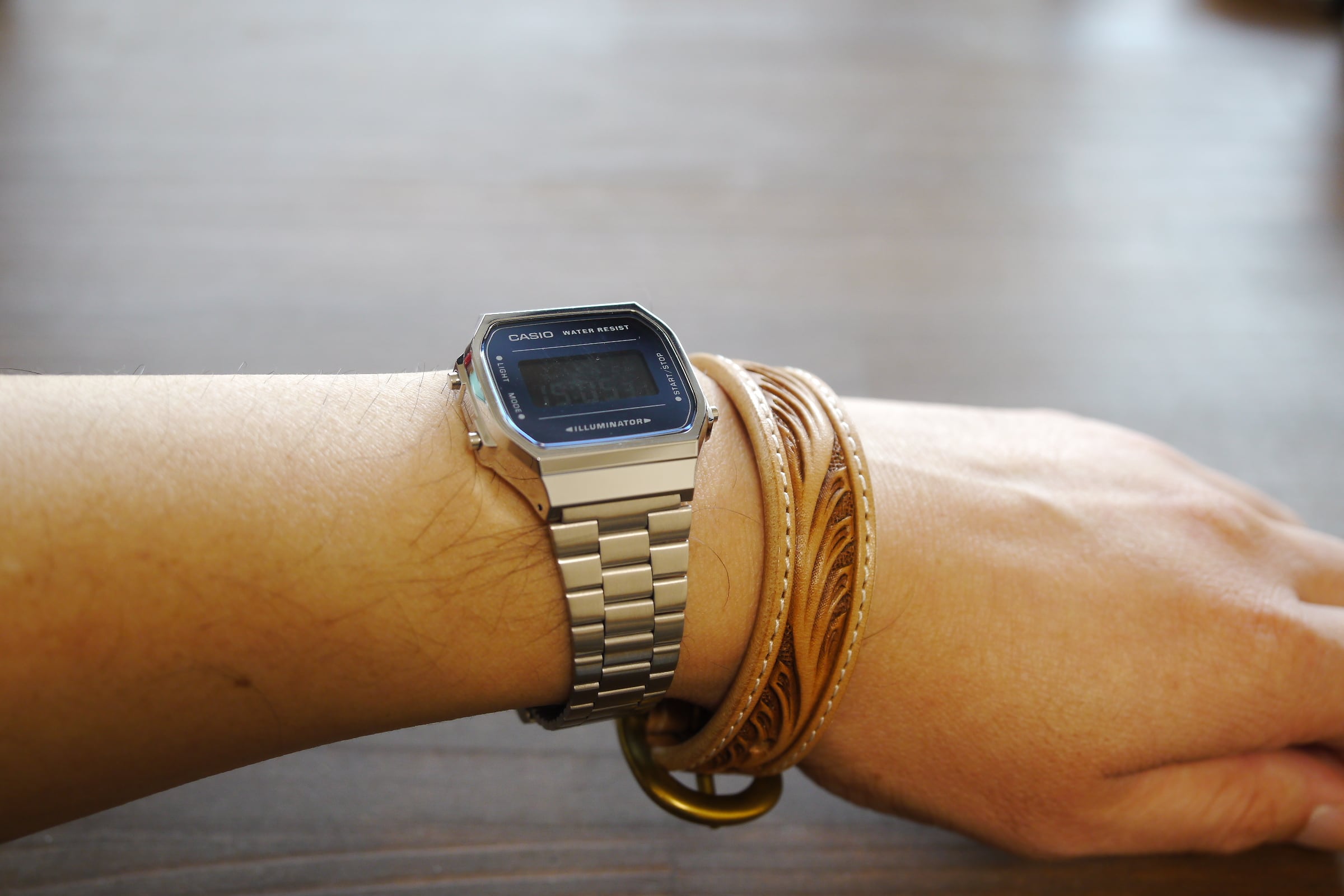 細身のベルトですので細目のシルバーバングルと合わせるとよりお洒落♪