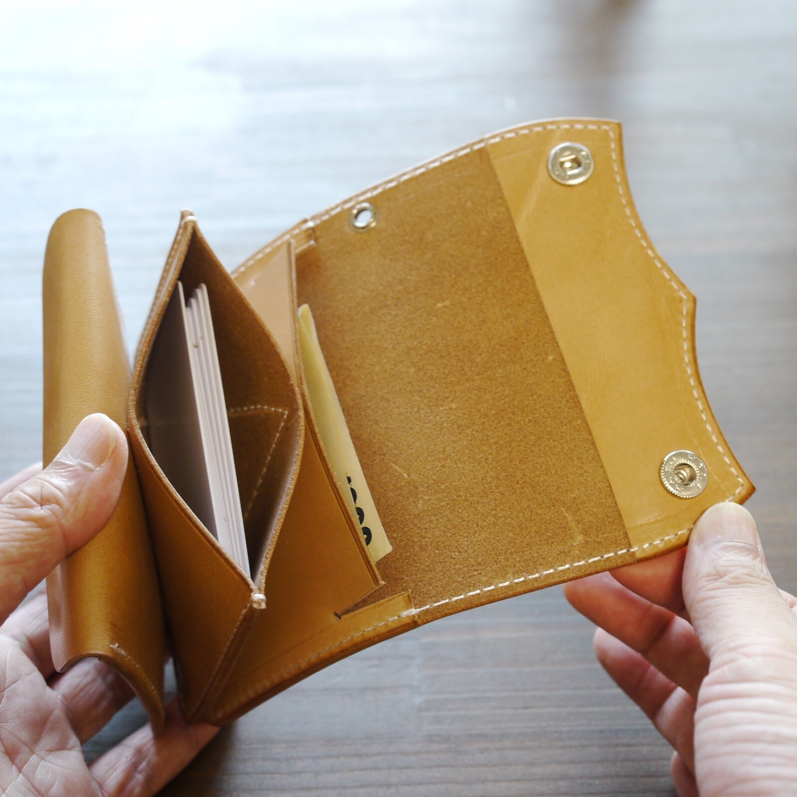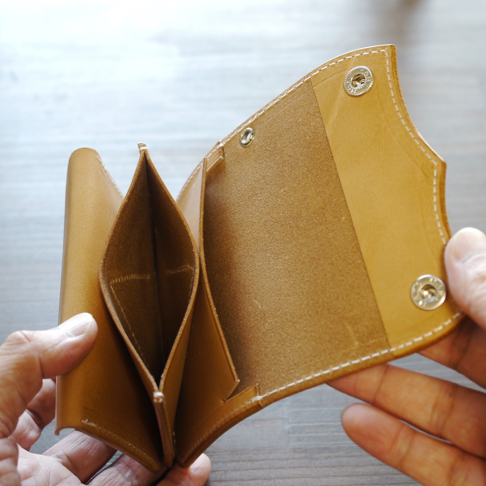 手前から小銭入れ、カード入れ、二つ折りで入る札入れとなっております。
